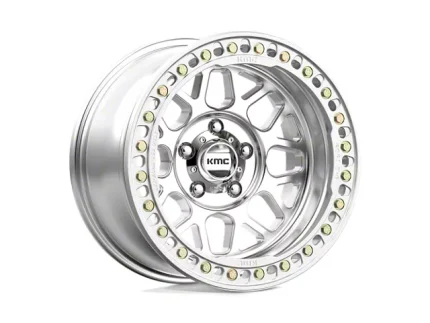 The KMC Grenade Crawl Beadlock Wheel is a durable, stylish 18x9-inch wheel with a 10mm offset, designed for 23-26 F-250 Super Duty trucks. Its beadlock feature improves tire security on rough terrains, and the machined finish provides an industrial look. Ideal for off-road enthusiasts, it enhances both performance and appearance.